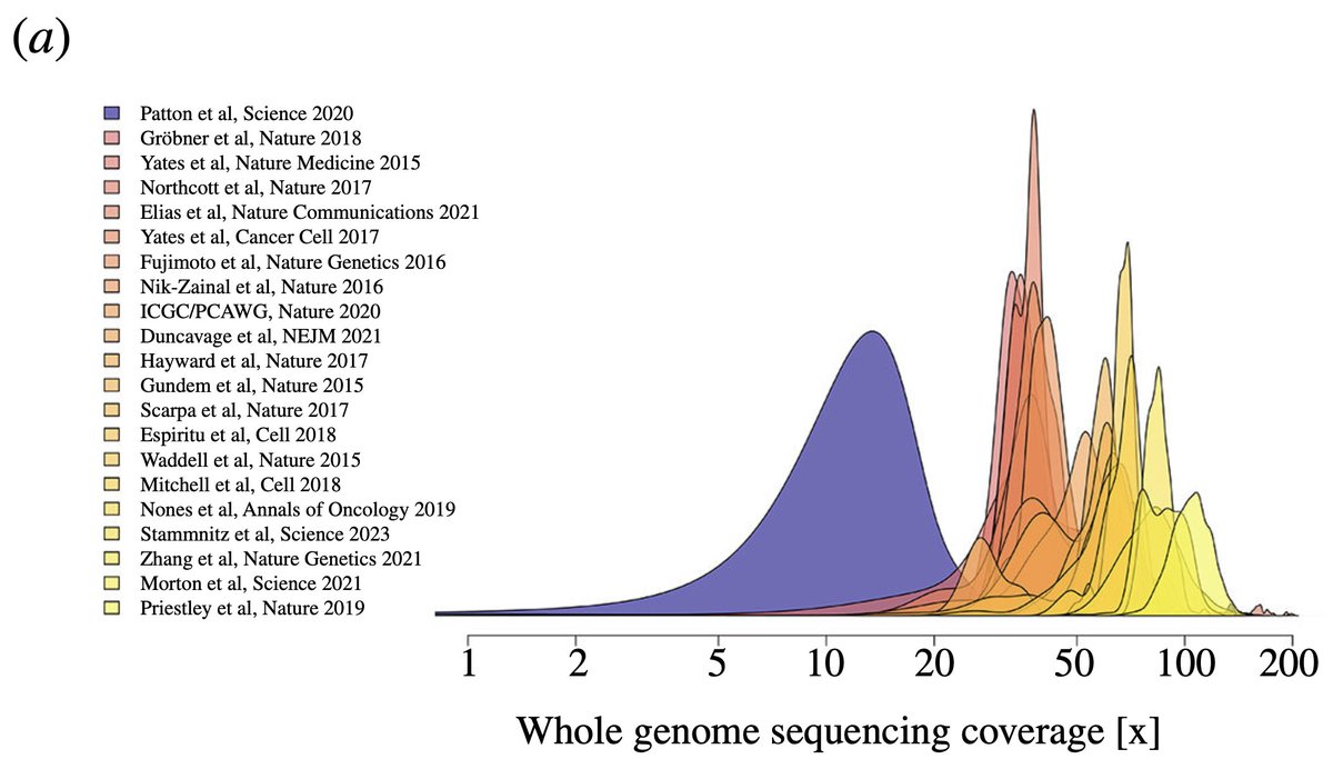 This plot shows whole genome sequencing depths across sample cohorts of twenty large-scale cancer genome data sets since 2015. A minimum of 30x is the standard, many modern studies reach >>60x.