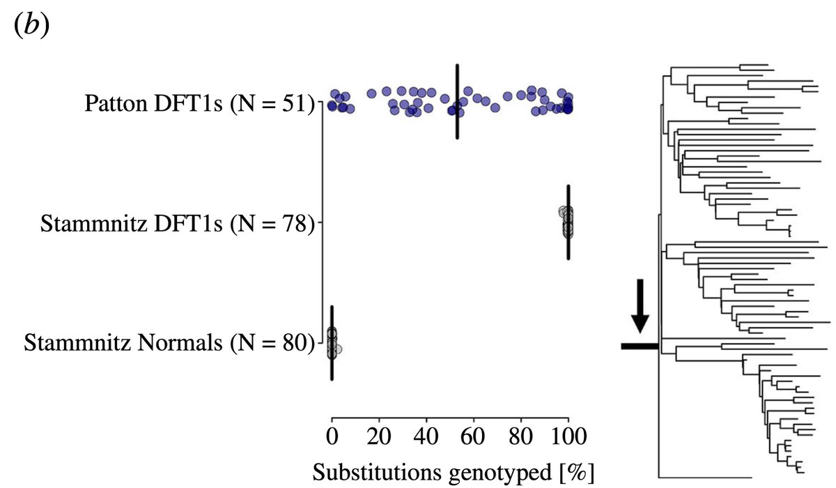We genotyped ~1,300 point mutants which occurred early in the evolution of DFT1, are thus expected to be present in all tumours but absent from any normal devil: