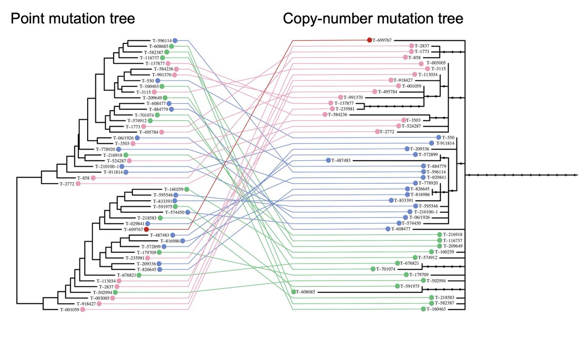 ... the original study’s tree, based on noisy point mutations, and our large copy-number based model LOOK NOTHING ALIKE! It’s 🍏 vs 🍊!