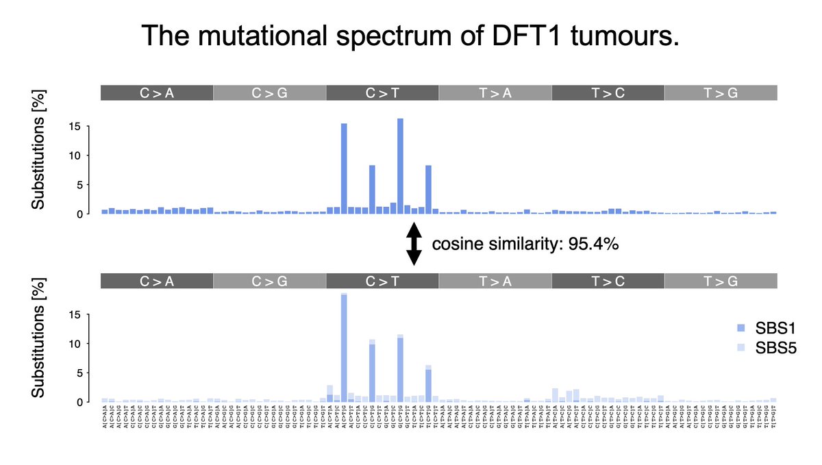 DFT1 tumours mostly feature the widely known endogenous signatures SBS1 and SBS5, with characteristic peaks. Low-quality point mutation/substitution calls flag up in the spectra.