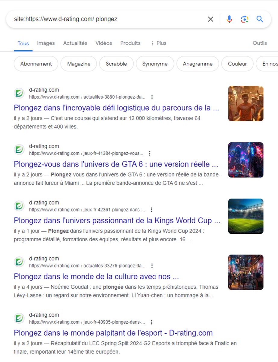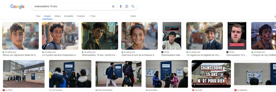 Bref tous ces sites sous bannière « Amanecer Media International SL » sont là pour une seule raison, créer du trafic, sur des recherches « simples » mais aussi sur l’actualité. Par exemple l’agression de shamseddine, D-rating est dans les premiers résultats avec des photos en IA