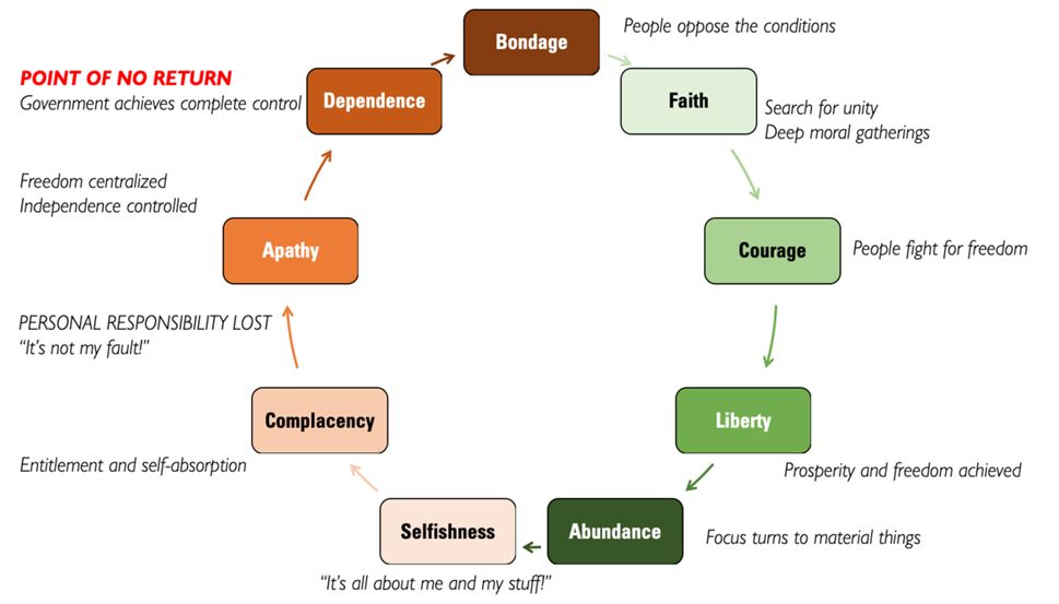 “From bondage to spiritual faith; spiritual faith to great courage; courage to liberty; liberty to abundance; abundance to selfishness; selfishness to complacency; complacency to apathy; apathy to dependence; dependence back into bondage”