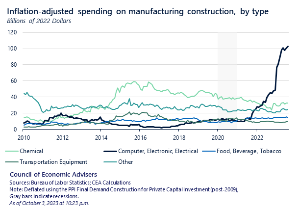 The laws are designed to crowd in private investment, and since they’ve passed, spending on manufacturing construction has nearly doubled, spurred by a massive increase in spending on manufacturing computer, electronic, and electrical goods. 3/ whitehouse.gov/briefing-room/…