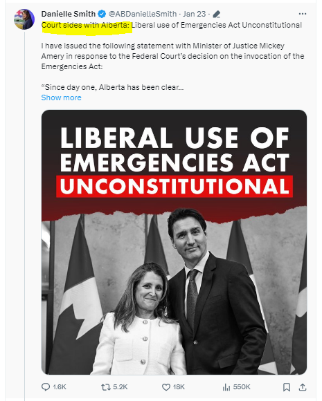 Reading the full text of the Federal Court decision on invocation of the Emergencies Act and posting interesting nuggets