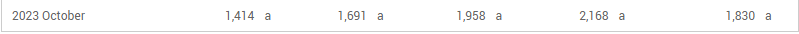 According to the @CMHC, these are avg. rents in Toronto [bachelor, 1 br, 2 br, 3, br, overall average] in Oct. 2015 (avg. $1,208) and Oct. 2023 (avg. $1,830)
