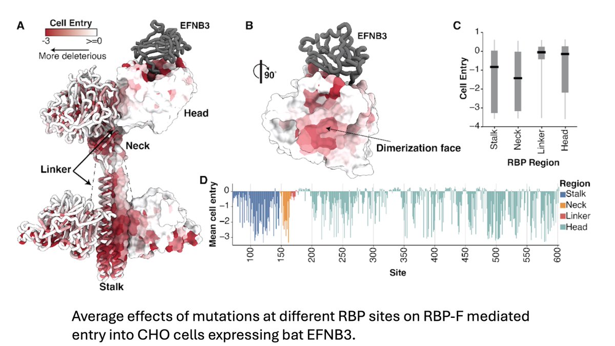 We also measured how all functionally tolerated RBP mutations affect binding to EFNB2 vs EFNB3, & identified specific mutations that increase binding to both or just one of the bat versions of these receptors