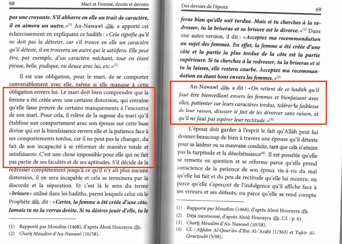 🔸"Le mari doit comprendre que la femme a été créée avec une certaine distorsion qui entraîne qu'elle fasse preuve de certains manquements à l'encontre de son mari. Pour cela, il relève de la sagesse du mari qu'il établisse son comportement avec son épouse sur cette base divine qui est la bienfaisance envers elle et la patience face à ses comportements tordus, car il ne peut pas la changer, du fait de son incapacité à se reformer de manière totale et satisfaisante. C'est une chose impossible pour elle qui ne fait pas partie de ses facultés et de ses aptitudes."