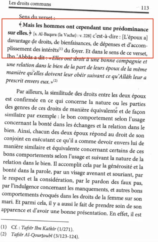 🔸"C'est à dire que l'homme a autorité sur la femme en ce sens qu'il est son dirigeant, son maître, celui qui détient le commandement sur elle et qui l'a corrige si elle s'éloigne de la vertu."