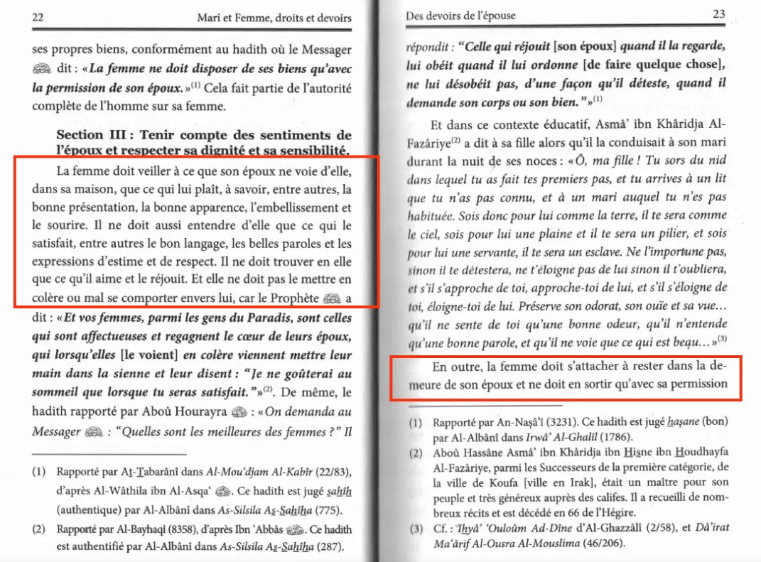 🔸"La femme doit veiller à ce que son époux ne voit d'elle, dans sa maison, que ce qui lui plaît, à savoir, entre autres, la bonne présentation, la bonne apparence, l'embellissement et le sourire. Il ne doit aussi entendre d'elle que ce qui le satisfait, entre autre le bon language, les belles paroles et les expressions d'estime et de respect. Il se doit de trouver en elle que ce qu'il aime et le réjouit. Et elle ne doit pas le mettre en colère ou mal se comporter envers lui."