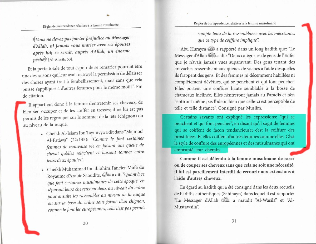 🔸"Il appartient donc à la femme d'entretenir ses cheveux, de bien s'en occuper et de les coiffer en tresses. Il ne lui est pas permis de les regrouper sur le sommet de la tête (chignon) ou au niveau de la nuque.