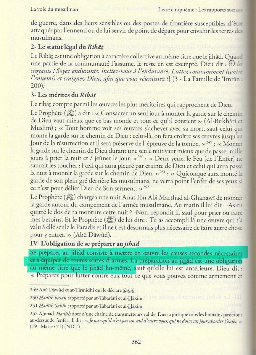 🔸"Se préparer au jihad consiste à mettre en oeuvre les causes secondes nécessaires et s'équiper de toutes sortes d'armes. La préparation au jihad est une obligation au même titre que le jihad lui-même."