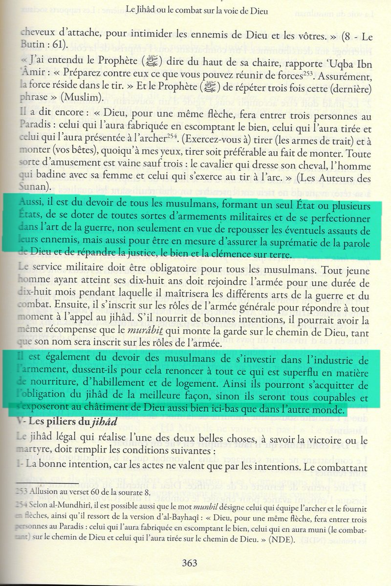🔸"Aussi, il est du devoir de tous les musulmans, formant un seul état ou plusieurs états, de se doter de toutes sortes d'armements militaires, non seulement en vue de repousser les éventuels assauts de leurs ennemis, mais aussi pour être en mesure d'assurer la suprématie de la parole de Dieu et de répandre la justice, le bien et la clémence sur terre."