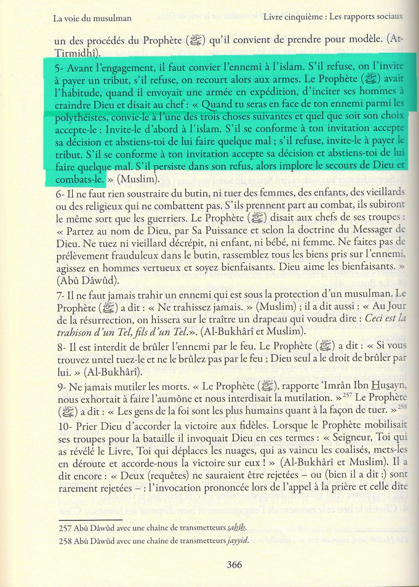 🔸"Avant l'engagement, il faut convier l'ennemi à l'islam. S'il refuse, on l'invite à payer un tribut, s'il refuse, on recourt alors aux armes, comme le faisait le prophète." ⬇️