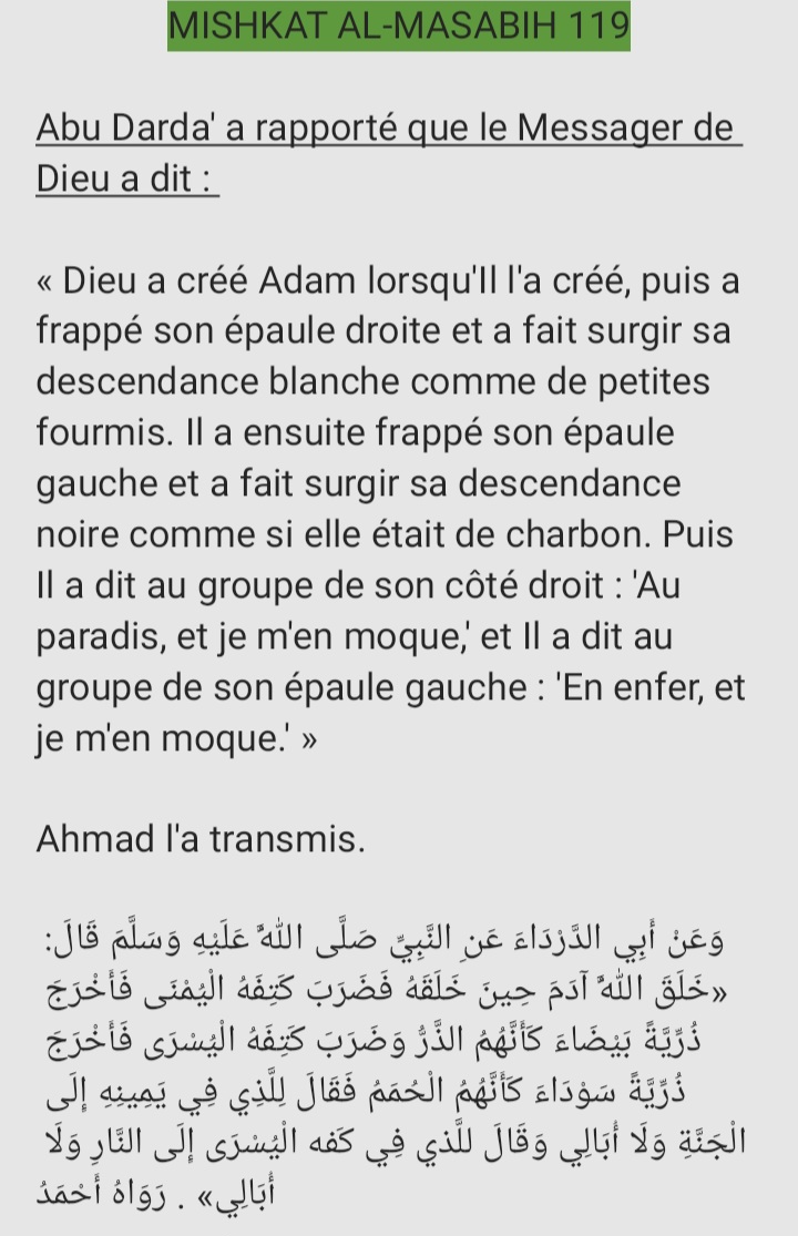 🔸Mishkat Al-Masabih 119 : Lors de la création de l'être humain, Allah a fait surgir des épaules d'Adam, une descendance blanche qui ira au paradis, et une descendance noire qui ira en enfer.