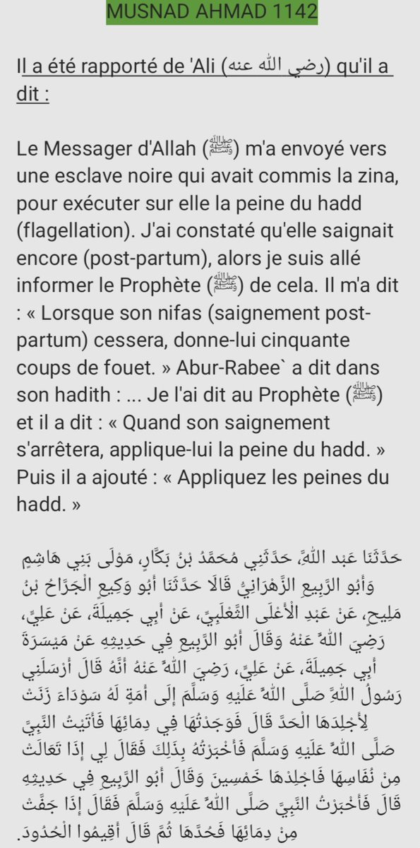 🔸Musnad Ahmad 1142 : Le prophète fait lapider une esclave noire.