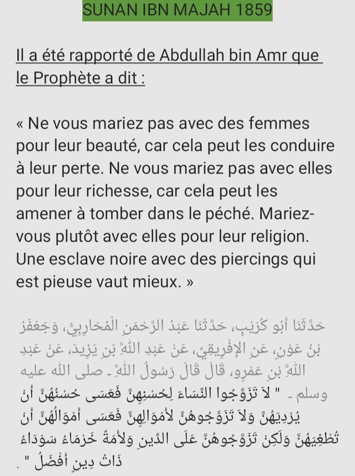 🔸Sunan Ibn Majah 1859 : Une esclave noire avec des piercings mais pieuse, est présentée comme le moins mauvais exemple pour se marier avec.