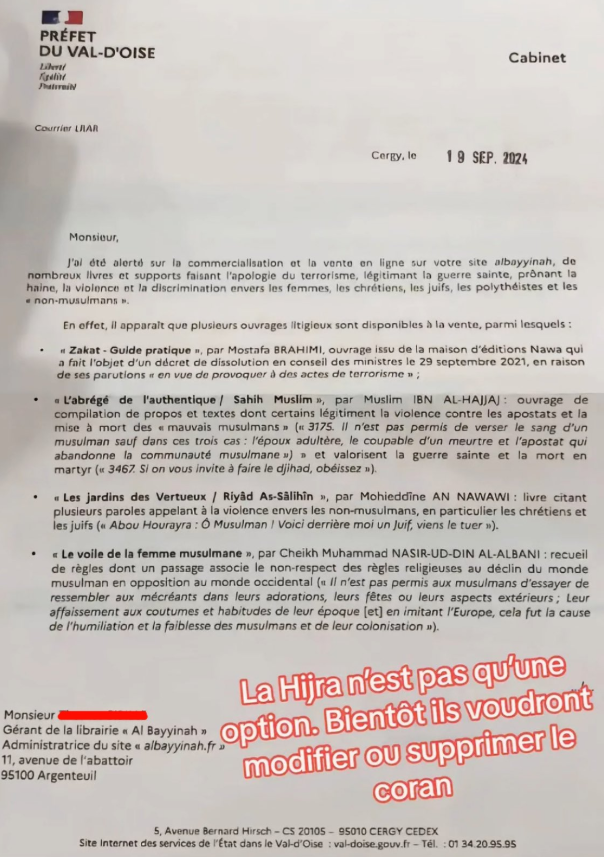 ➡️K. Baradji tourne cette interview dans la librairie islamique Al Bayyinah, qui a reçu une lettre du préfet du Val d'Oise en Septembre 2024 mentionnant la vente de livre faisant je cite :