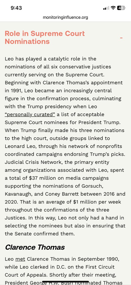 14/ “Leo has played a catalytic role in the nominations of all six conservative justices currently serving on the Supreme Court,” and he ‘personally curated’ a list of acceptable Supreme Court nominees for … Trump.” monitoringinfluence.org/org/leonard-le…