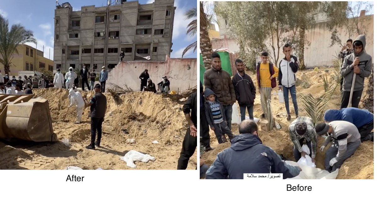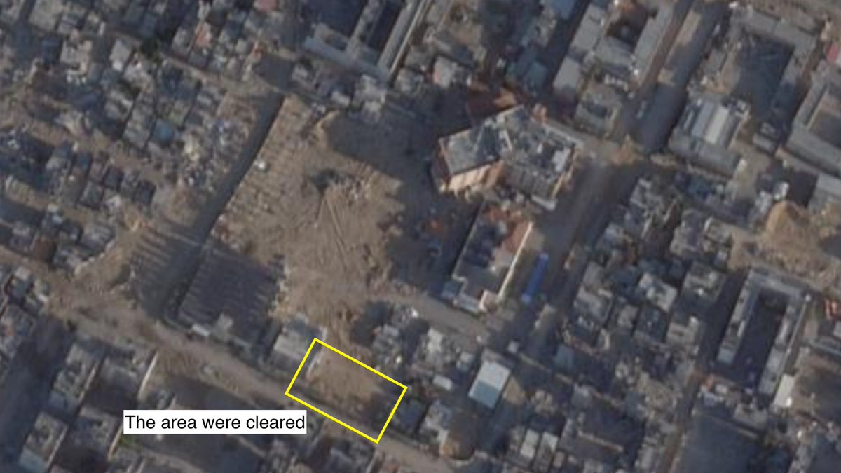 2- The analysis omitted crucial information from sat imagery. Following the same timeline, the IDF entered Nassir Hospital on Feb 15. high-resolution image from Feb 14, the day before the attack, shows that the graves Palestinians dug were located beneath trees that were still present on Feb 14