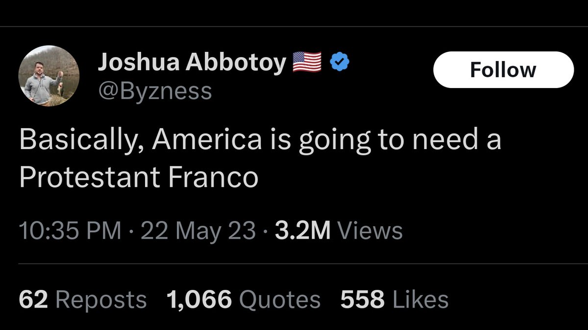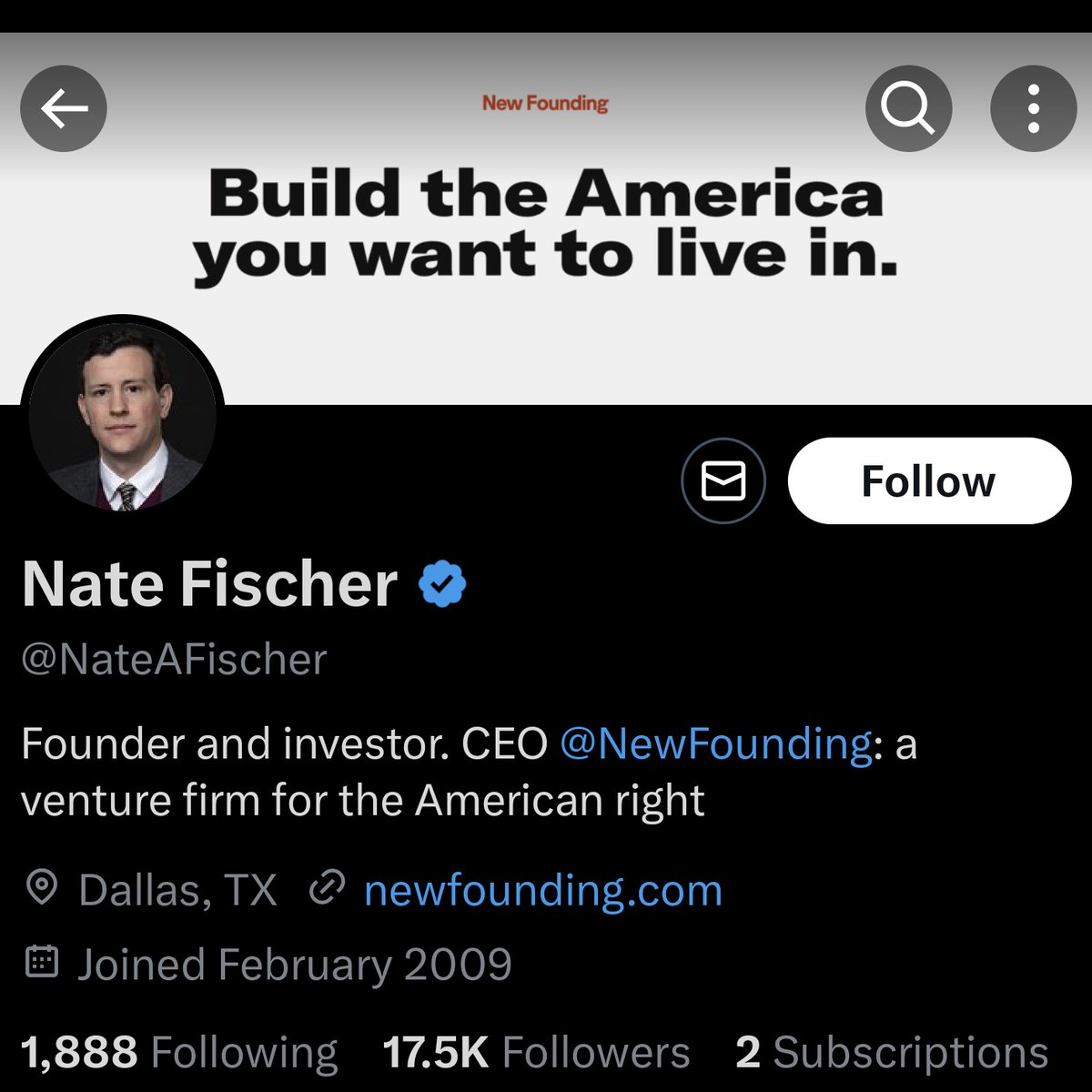 This great reporting about a secret society of wealthy right-wing Christian men who want to staff an “aligned future regime” that may come potentially via a “national divorce" notes the Dallas chapter is led by Nate Fischer, who I hadn't heard of but had already blocked me.