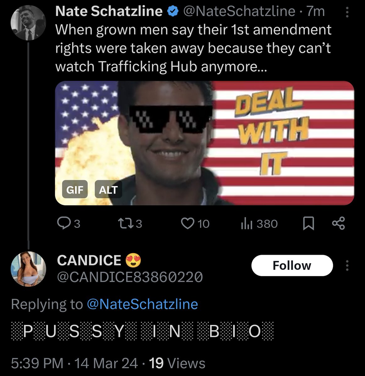 Texas State Rep. Nate Schatzline (R), who has said he believes all pornography should be banned, also celebrated Pornhub leaving Texas and received identically ironic responses.