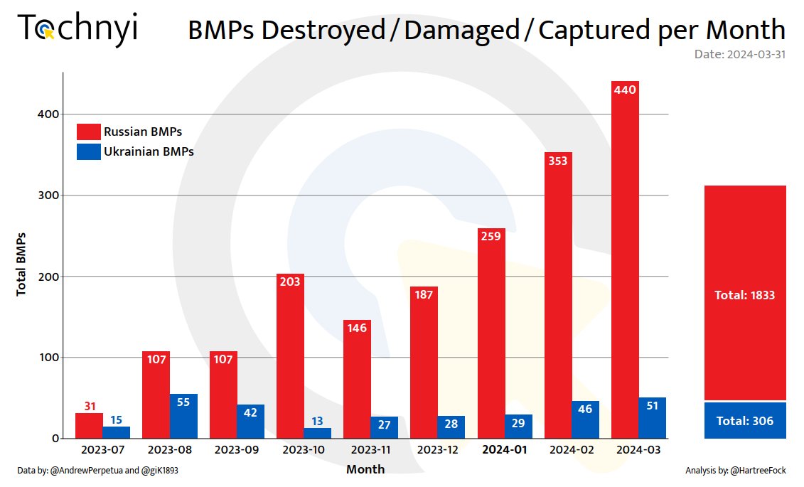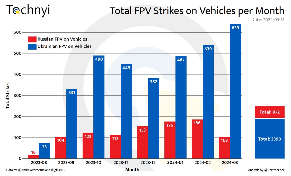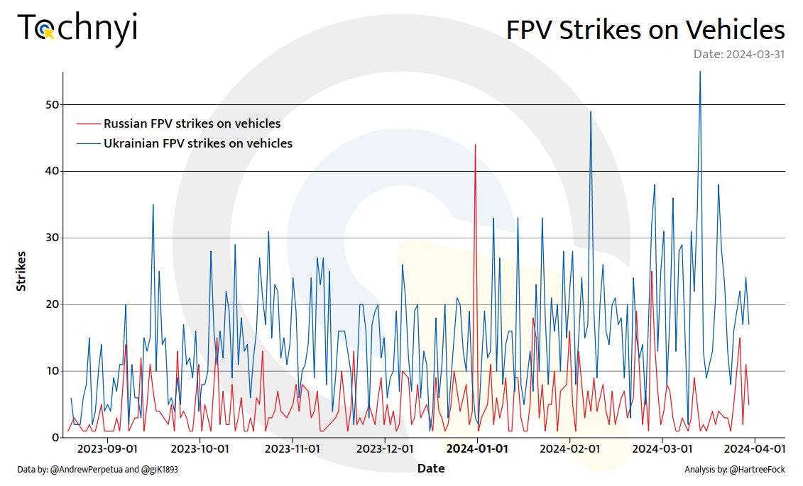 2/4 Ukraine currently holds a significant advantage in both infantry and vehicle categories. This is a result of recent failed attacks by Russian forces. Ukrainian troops have been effectively utilizing FPV drones as a defensive tool, which could potentially initiate a new era of mobile defence doctrine. I recently discussed the concept of area defence and its limitations in an article, which can be found at . It is encouraging to see the new leadership utilising more mobility in their defence strategy. However, only time will tell if this move proves to be successful.tochnyi.info/2024/03/trench…