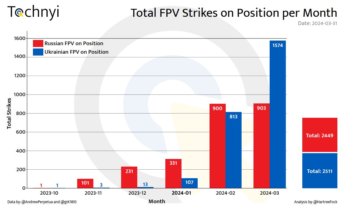 7/n The use of First Person View (FPV) drones in attacking positions has been noted to have significantly changed the ground situation. The graph illustrates the data collected and verified through geolocation and analysis of open-source videos. From January to February 2024, Russia increased the number of its FPV drone attacks on Ukrainian positions. This strategy was particularly effective in denying the defenders the ability to hold their positions, especially during urban fighting in both Marinka and later in Avdiivka, as demonstrated in a previous article. However, Ukrainian forces quickly responded and achieved a certain level of parity in February. Remarkable in this regard is the number of strikes registered in March, with Ukraine recording 1574 strikes against Russian positions, while Russia maintained a high level of strikes, 903 in total.