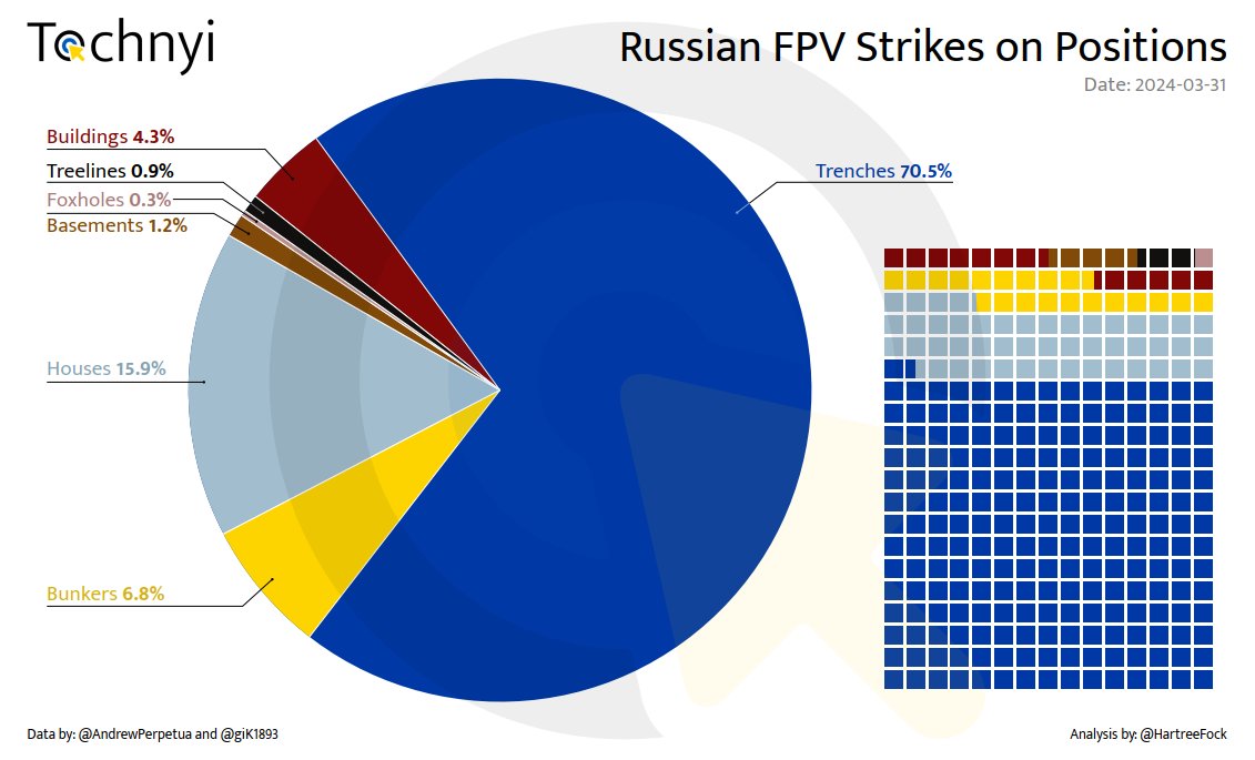 8/n In any analysis of strikes on positions, it is important to understand where most of the Russian FPV drone strikes have occurred. Overall, 70.5% of all the strikes have targeted trenches. As previously analyzed, the precision of FPV drone strikes poses a significant threat to defensive lines, especially when exposed to unchallenged aerial reconnaissance performed by surveillance drones using thermal vision. Houses are the second most struck target and become even more vulnerable when Russian ground forces move their offensive operations into towns.