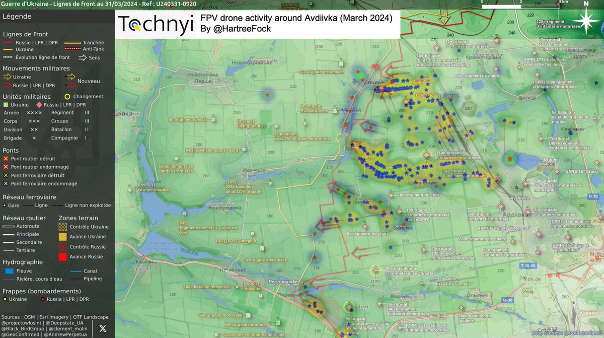 When we superimpose the map created by Poulet and the data of Ukrainian FPV drone strikes (represented by blue stars), we can get a better understanding of the importance of the directions where Russian forces attempted to push the Ukrainian lines forward - the Stepove-Berdychi direction and the Lastochkyne-Orlivka direction. Going south, there are two more vectors, from Tonenke and lastly towards Pervomaiske in the defense of Avdiivka’s western areas.