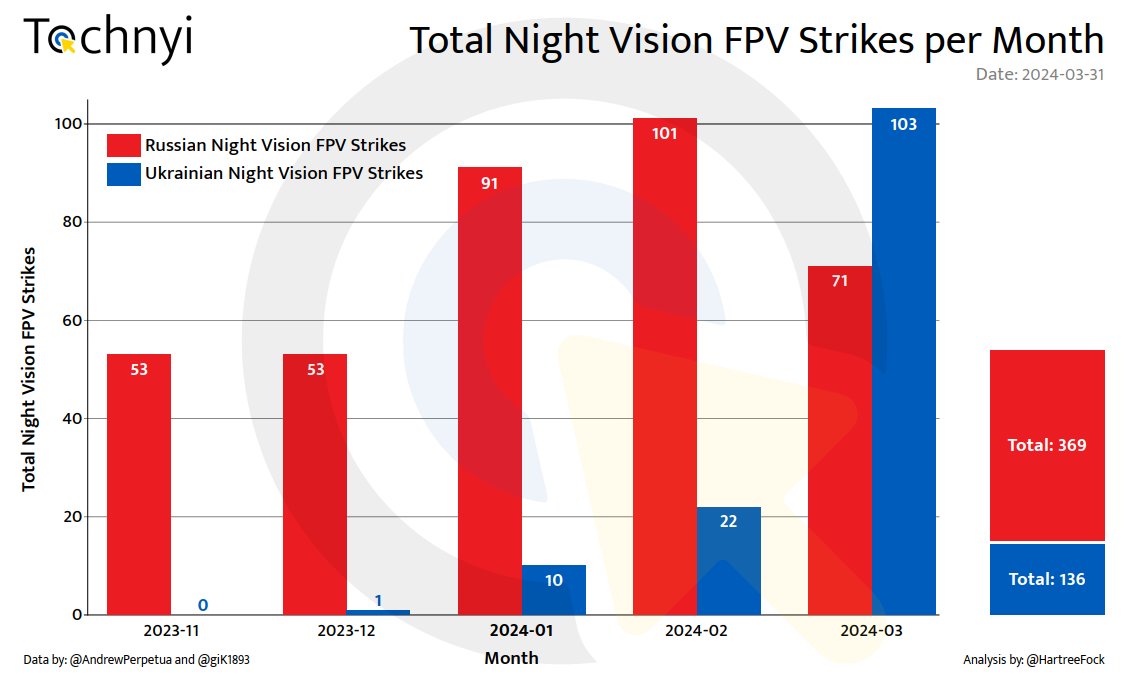 Another area where significant changes have occurred is night vision usage in FPV drones. This constitutes a significant development and, as the collected data shows, Russian FPV drones with night vision capabilities have had considerable success since their introduction in November 2023, with no apparent recorded response from Ukrainian forces.