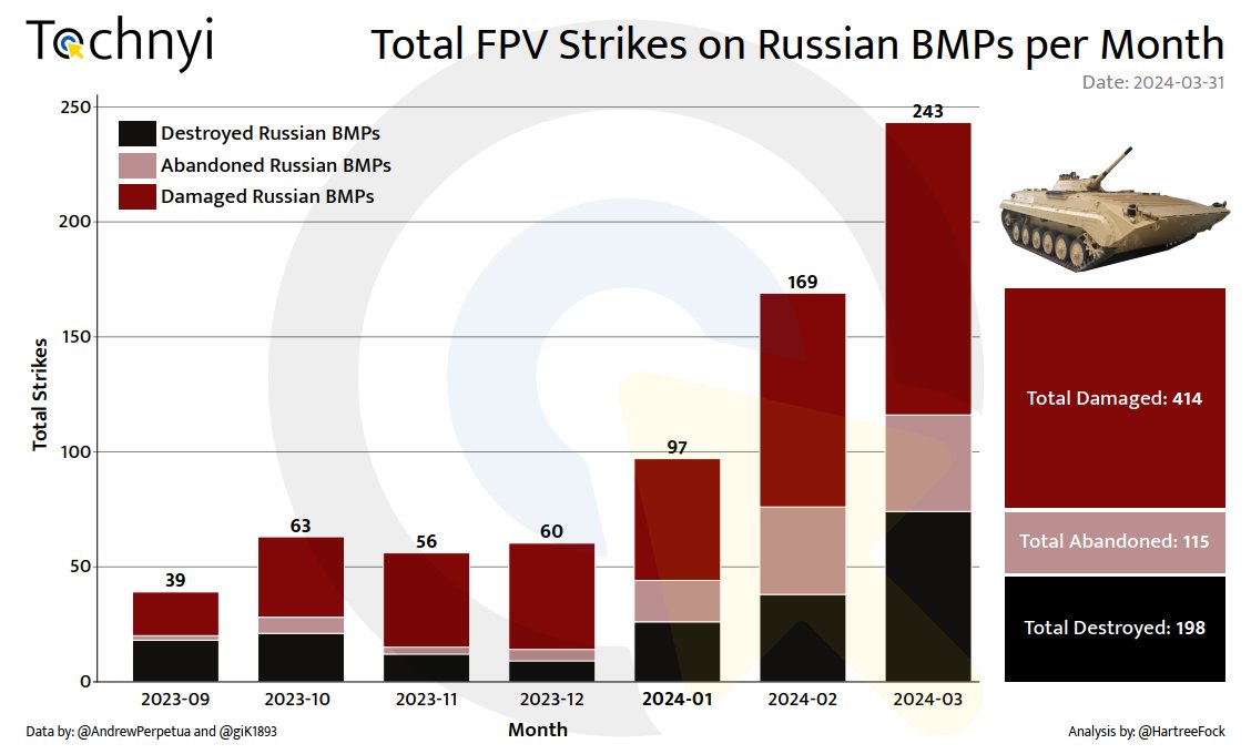 16/n An even more dramatic toll on Russian vehicles is observed in the data from FPV drone strikes on all BMP types, where a total of 727 visually confirmed strikes were recorded. Among these, 57% of said strikes resulted in clear vehicle loss due to damage, 27% led to the destruction of the vehicle and the remaining strikes led to abandonment or capture of the vehicle in question. The increasing number of Russian IFVs destroyed is indicative of a continuation of an offensive doctrine adopted by the Russian forces in the early stage of the new year.