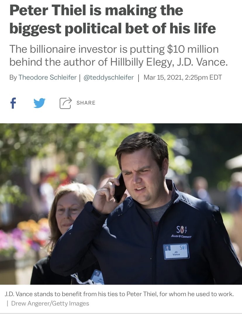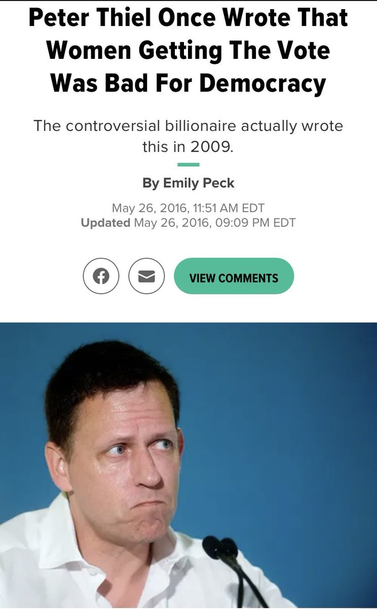 “Peter Thiel Once Wrote That Women Getting The Vote Was Bad For Democracy” (It was Thiel who bankrolled JD Vance’s last campaign. Vance is reportedly on Trump’s VP shortlist.) 1/ huffpost.com/entry/peter-th…