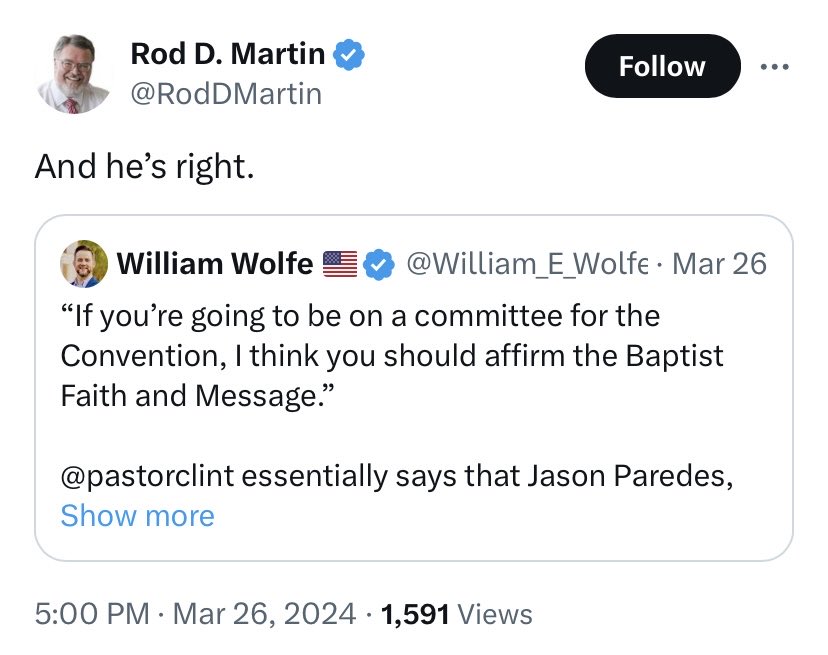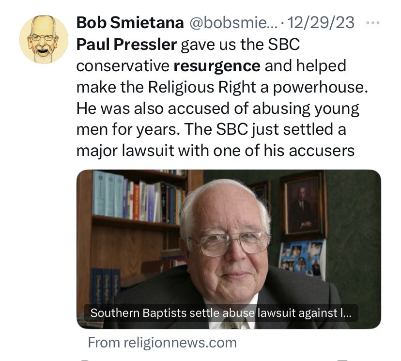 24/ Paul Pressler was a key architect of the so-called “conservative resurgence” in the SBC, which William Wolfe strives to emulate in an effort to push the SBC even further to the right. Pressler fan boy Rod Martin seems to support Wolfe’s project.. religionnews.com/2023/12/29/sou…