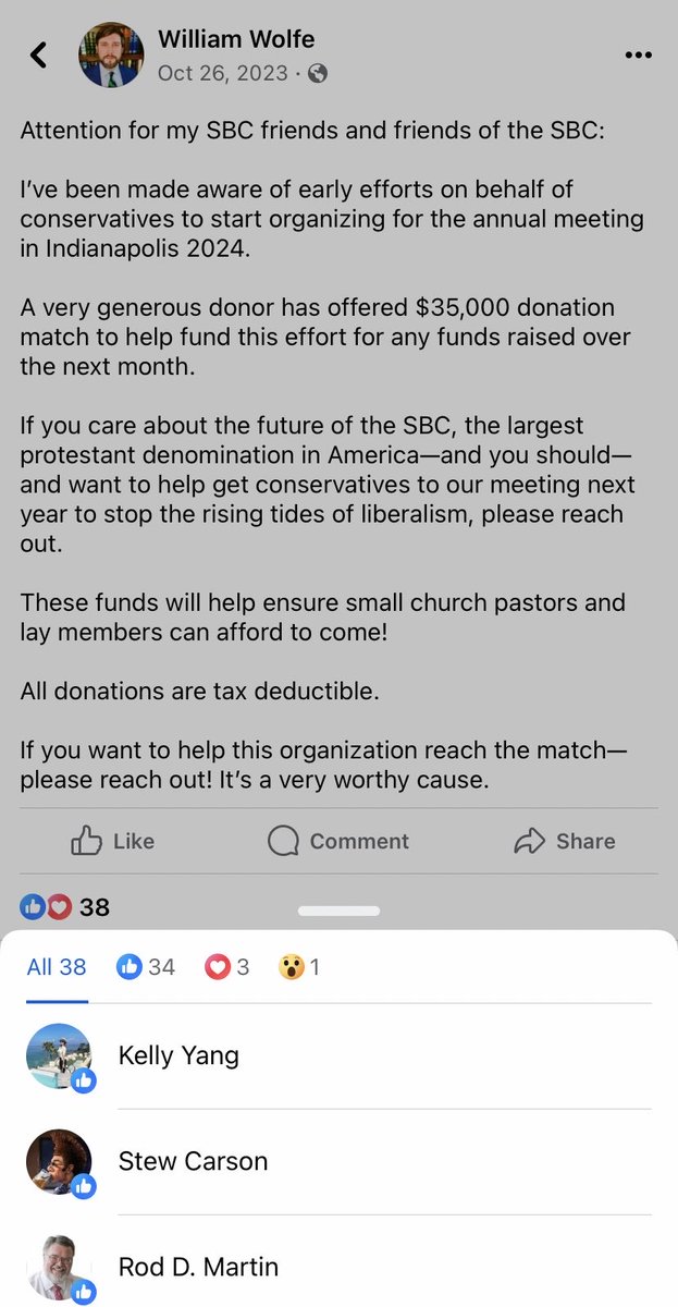5/ If you click the screenshot, you will see that Rod Martin liked this FB post by William Wolfe about an u identified donor offering a 35k donation match to prepare for the SBC meeting (election) in June 2024.