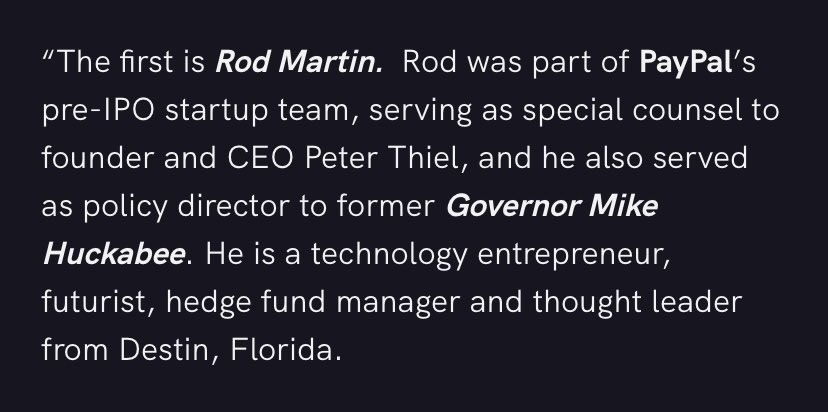 16/ Rod Martin was “part of PayPal’s pre-IPO startup team, serving as special counsel to founder and CEO Peter Thiel, and he also served as policy director to former Governor Mike Huckabee.” blog.loor.tv/blog/rod-marti…