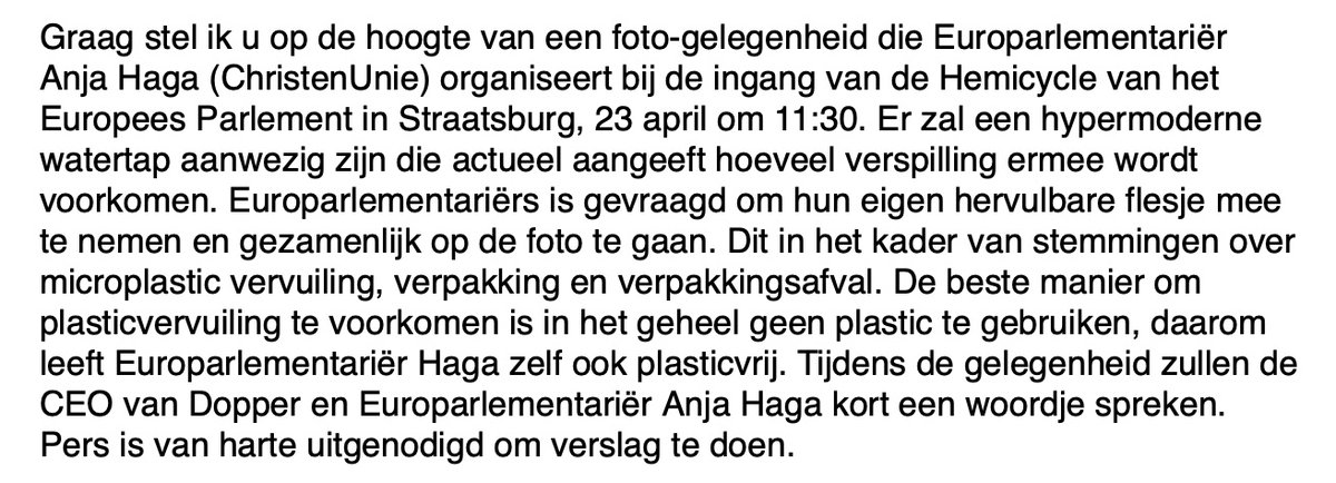 Dit gaat over wetgeving over plasticvervuiling die morgen in stemming wordt gebracht. Het is niet zeker dat die wetgeving het haalt. Haga heeft Dopper uitgenodigd om hier te staan.
