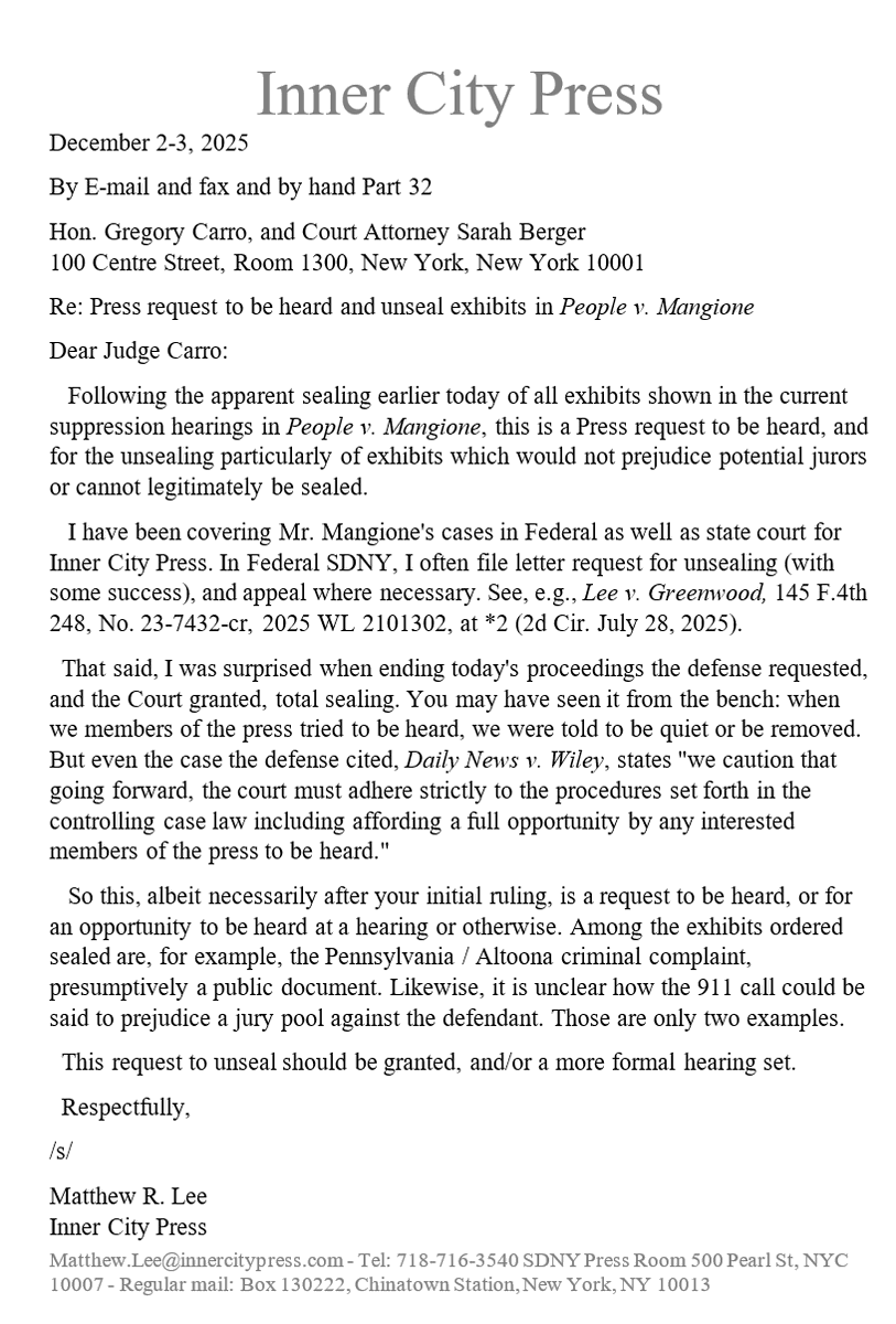 OK - now in Luigi Mangione Day 6 of suppression hearings in NYS case, Inner City Press on Dec 3 filed letter to unseal exhibits matthewrussellleeicp.substack.com/p/extra-inner-… & some have been unsealed Dec 4 & on, many used. 1st Book amazon.com/dp/B0FYJ7MBX3/ 2d soon & will live tweet, thread below