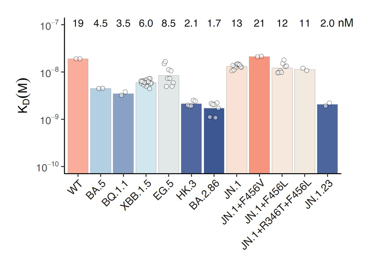 Additionally, we found that JN.1+F456L and FLiRT showed equal ACE2 binding affinity compared to JN.1, and JN.1.23, which carries a Y453F mutation, exhibits greatly enhanced ACE2 binding. Acquisition of more immune-evasive mutations should be closely monitored for JN.1.23.