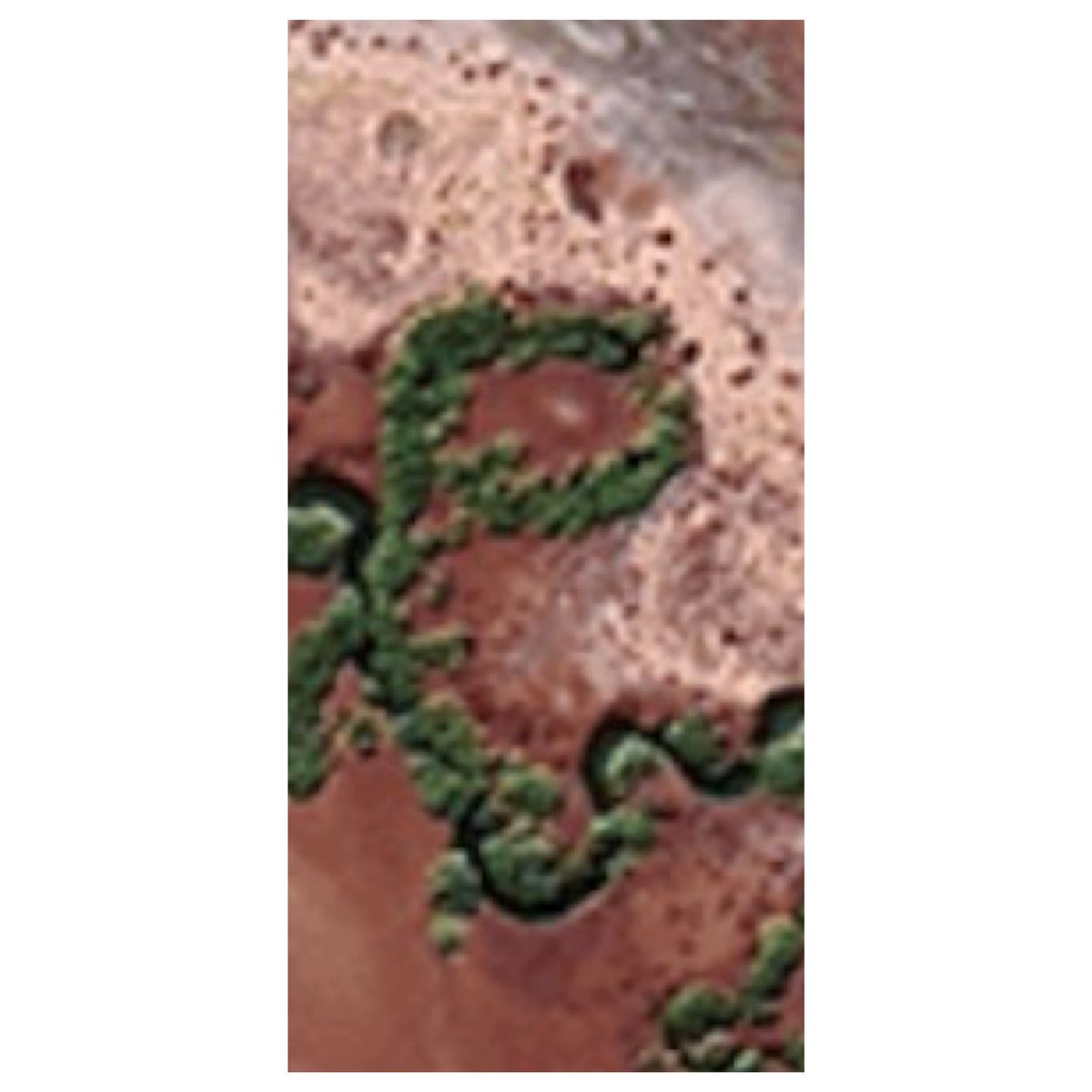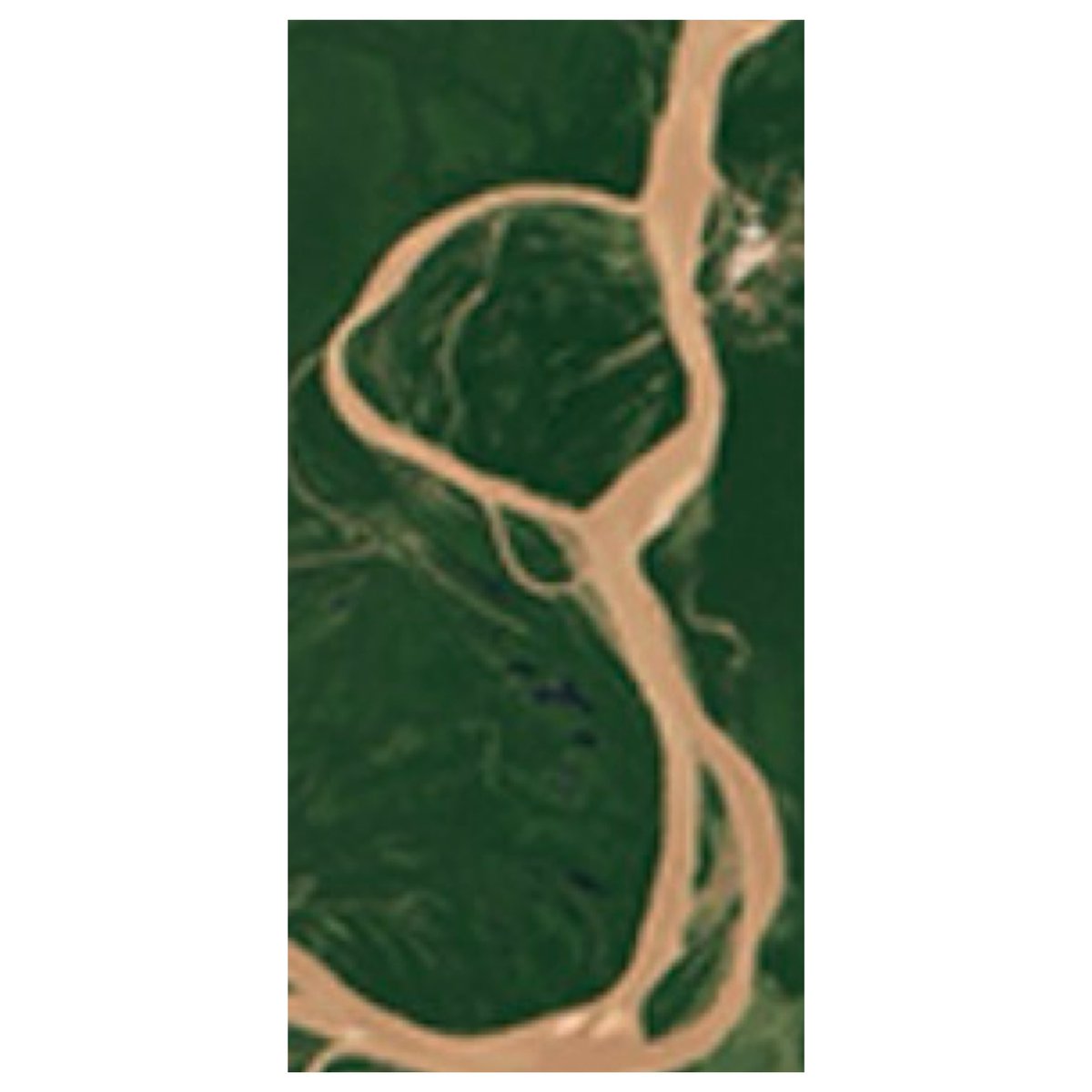 The second G depicts the serpentine streaming of the Rio Guainía, one of the largest tributaries of the Amazon River. The river flows through theJaú National Park in Brazil, one of the largest forest reserves in South America, listed as a UNESCO World Heritage Site. This park helps protect a wide range of species, including bush tigers, jaguars, giant otters, and Amazonian manatee. This NASA USGS EROS Data Center Satellite Systems photo is a bit dated (2002) but reflects well the opulence of this part of our planet.