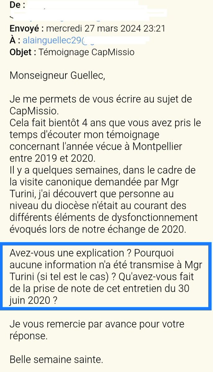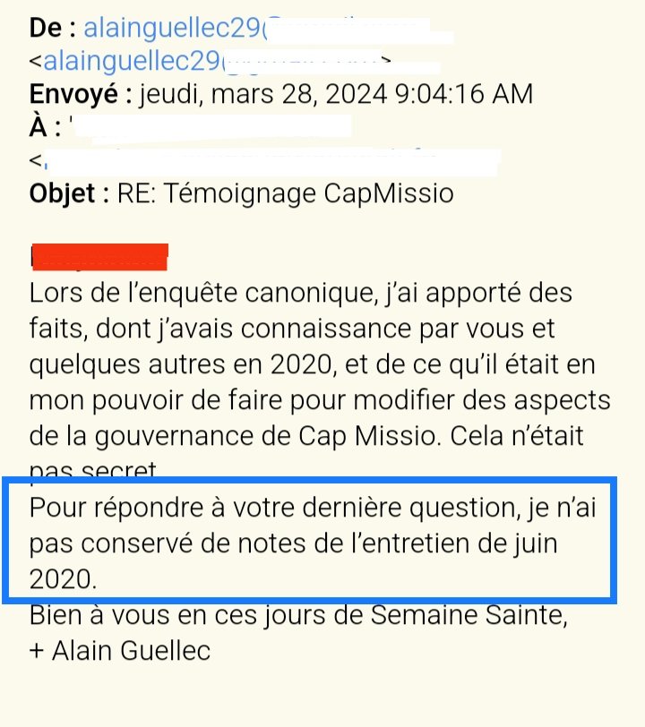 Mgr Guellec, qui n'est pas juriste de formation, ne conserve pas les alertes qui lui sont faites (il n'y a pas eu que celle-ci) et ne les a visiblement pas montrées à un magistrat.
