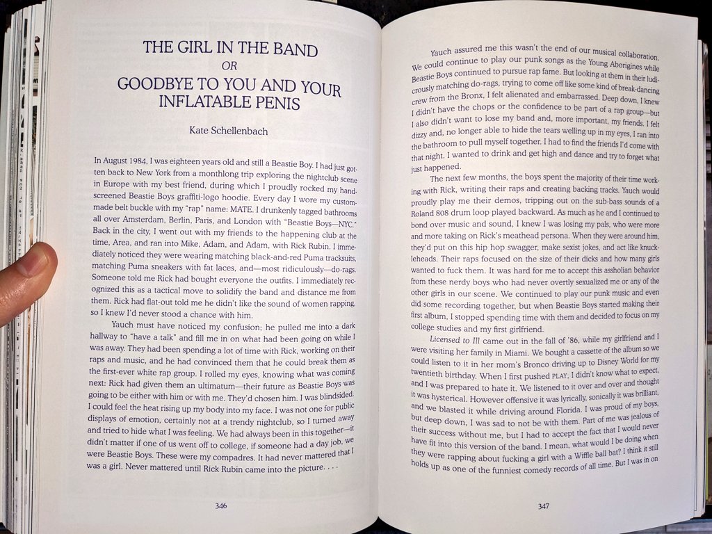 Por falar nela, Kate Schellenbach, membro fundador dos Beastie Boys, tem um capítulo escrito por ela dedicado quase exclusivamente a comer o cy do Rick Rubin, que foi o responsável direito pela sua saída. E até hoje cês ficam pagando pau pra livro de auto-ajuda desse pilantra.