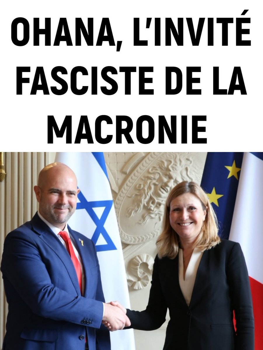 La présidente macroniste de l'Assemblée @YaelBRAUNPIVET a accueilli le chef de la Knesset Ohana, en plein #Gaza_Genocide.