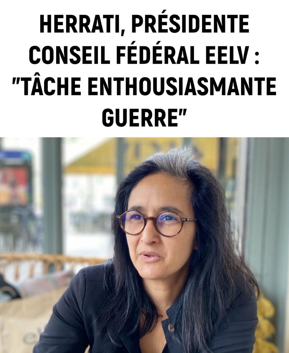 La présidente du Conseil fédéral d'EELV Herrati a repris un sondage qu'on sait tronqué, vantant l'amour de la guerre des jeunes : "un récit commun progresse dans notre jeunesse... comme une tâche enthousiasmante Guerre... un jeune Français sur 2 se dit prêt à s'engager" 3/21