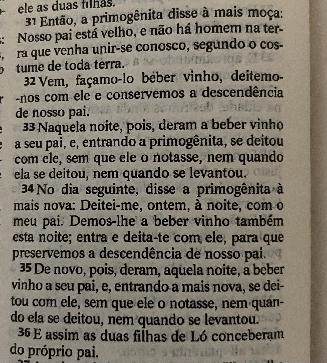 eu só ia voltar mais tarde MAS EU TO MUITO PERTURBADA COM ESSA PARTE. as filhas de ló acharam que era de bom tom embebedar >o próprio pai< e engravidar dele. e elas fizeram. e elas engravidaram. chega, chega de incesto!!! tá pior que game of thrones isso aqui.
