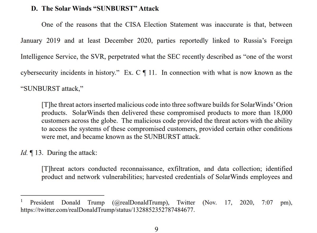 2) Trump's attorney throws in Ron Watkin's QAnon conspiracy that the Solar Winds breach had to do with the election.