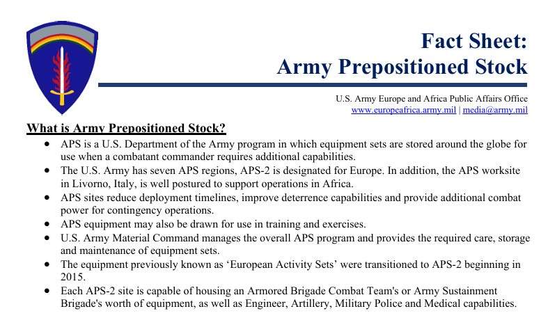 4/ viel material ist bereits in europa, in den APS-2 sites. APS = army prepositioned stock (=materiallager vor ort). wers noch nicht kennt, kann sich hier belesen: