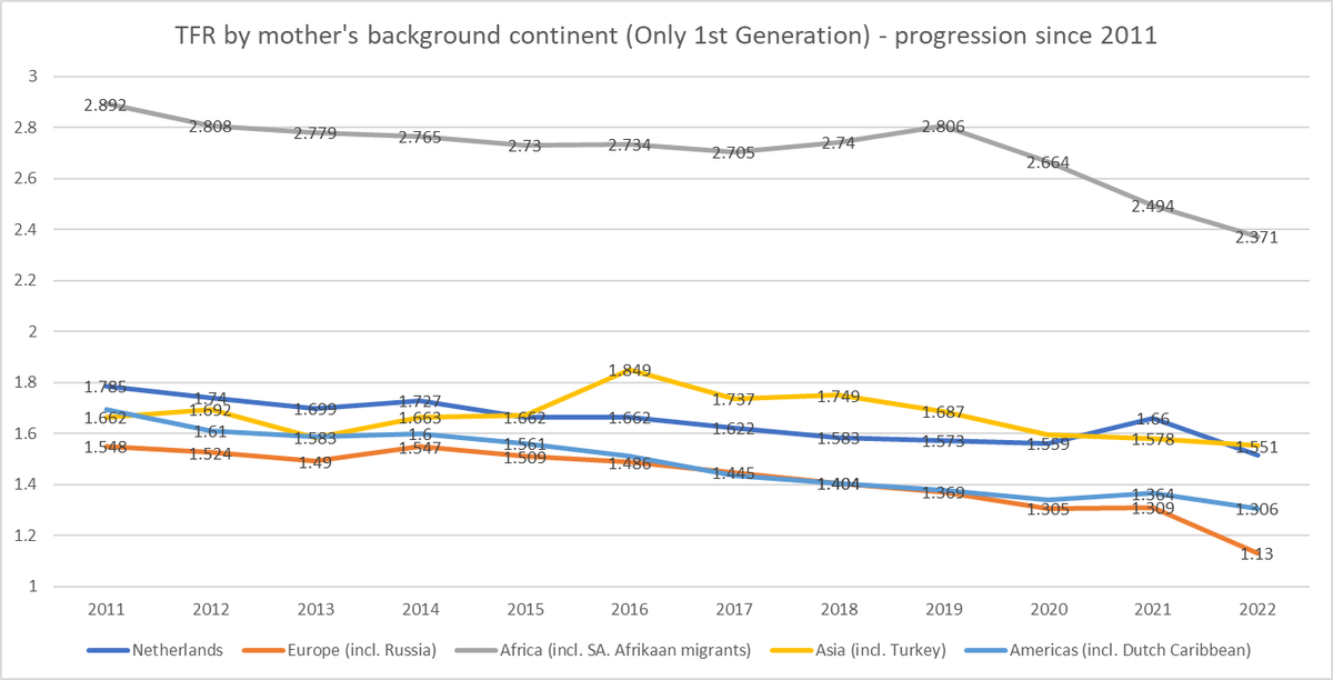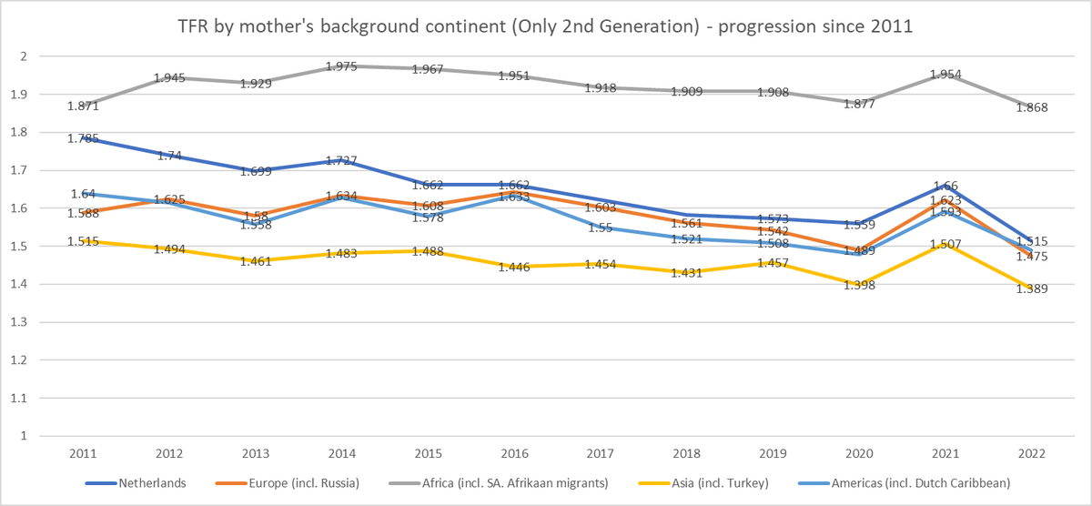3). When looking at 1st vs. 2nd generation, we can see that fertility for 1st generation migrants is higher, but that for African mothers is falling rapidly and European mothers are dangerously close to falling below 1.0