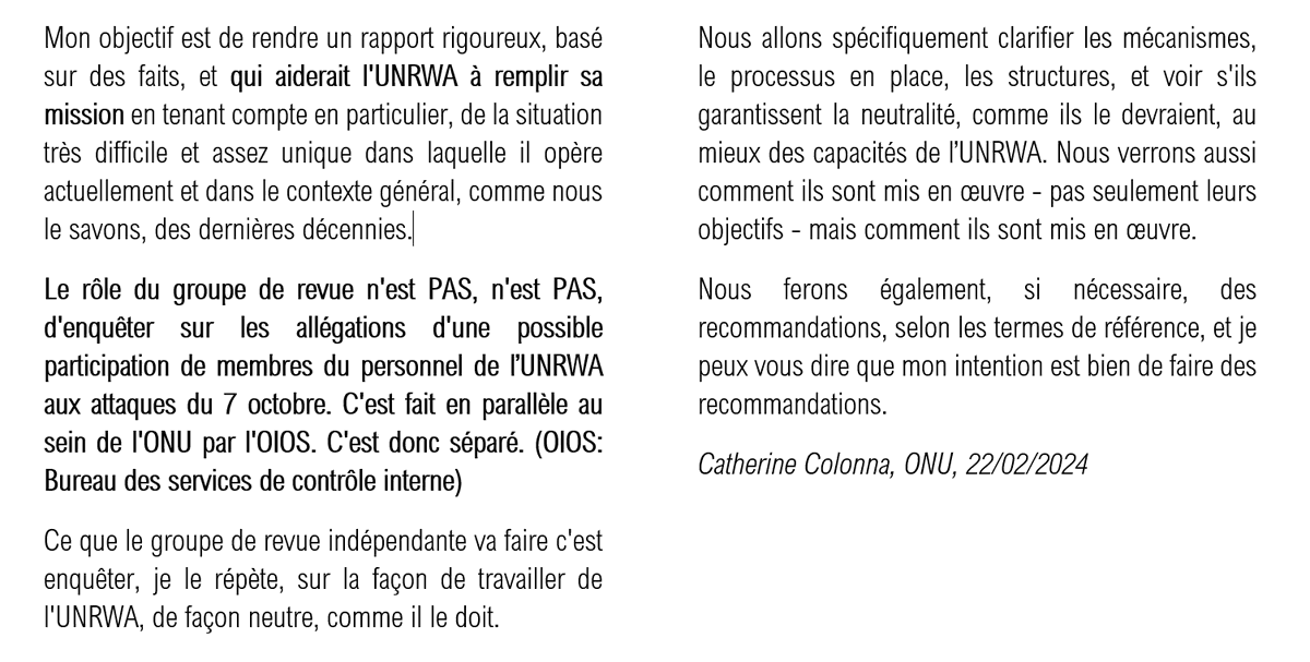 "Le rôle du groupe de revue n'est PAS, n'est PAS, d'enquêter sur les allégations d'une possible participation de membres du personnel aux attaques du 7 octobre. C'est fait en parallèle au sein de l'ONU par l'OIOS. C"est donc séparé"