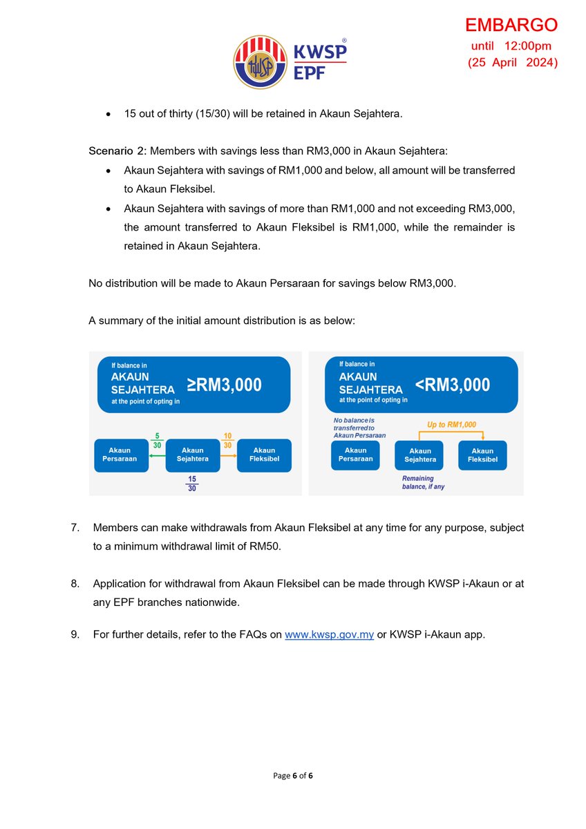3. EPF members will have a one time option to transfer part of the savings balance in their Akaun Sejahtera as an initial amount to Akaun Fleksibel.