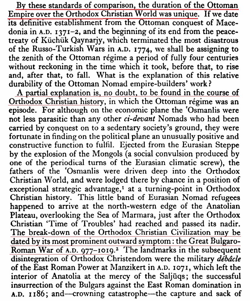 If accounting the Seljuk Sultnate & Beyliks which it shattered into as nomadic intruders, the Ottoman state from which it sprang was historically unique in its longevity. Toynbee considers breakup of Orthodox Civilisation instrumental in this success, though not the whole story.